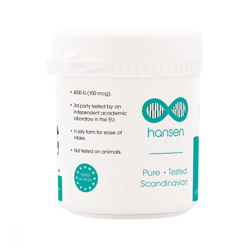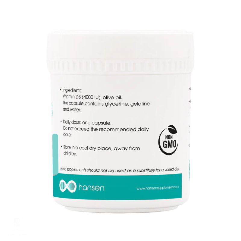 Vitamin D3 from Hansen is the most absorbable variant of vitamin D3. The vitamin D3 is processed in softgel capsules combined with olive oil for quick and complete absorption. Vitamin D3 plays an essential role in our body because, among other things, it promotes the normal functioning of the immune system, contributes to the maintenance of strong bones and is beneficial for the muscles.